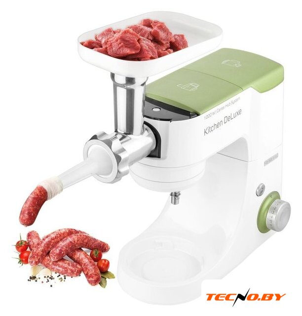 | Полная комплектация | крюк для замеса, взбивающий венчик в форме буквы А, сферический венчик для взбивания. Насадка для заполнения копченостей с 2 диаметрами. 2 бутылки из материала Тритан с 2 охлаждающими элементами (ICE STICK). Настольный миксер с титановыми лезвиями объёмом 1,25 л. Многофункциональный кухонный комбайн объемом 1,25 л, с 4 насадками и измельчителем. Мясорубка для грубого и мелкого помола с насадкой для заполнения копченостей с 2 диаметрами. Чаша для замеса объёмом 4,5 литра из нержавеющей стали и измерительной шкалой |