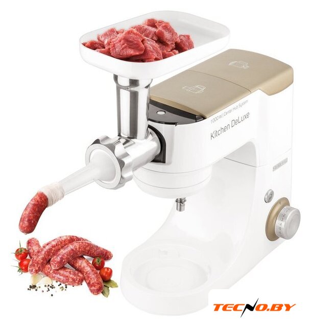 | Полная комплектация | крюк для замеса, взбивающий венчик в форме буквы А, сферический венчик для взбивания. Насадка для заполнения копченостей с 2 диаметрами. 2 бутылки из материала Тритан с 2 охлаждающими элементами (ICE STICK). Настольный миксер с титановыми лезвиями объёмом 1,25 л. Многофункциональный кухонный комбайн объемом 1,25 л, с 4 насадками и измельчителем. Мясорубка для грубого и мелкого помола с насадкой для заполнения копченостей с 2 диаметрами. Чаша для замеса объёмом 4,5 литра из нержавеющей стали и измерительной шкалой |