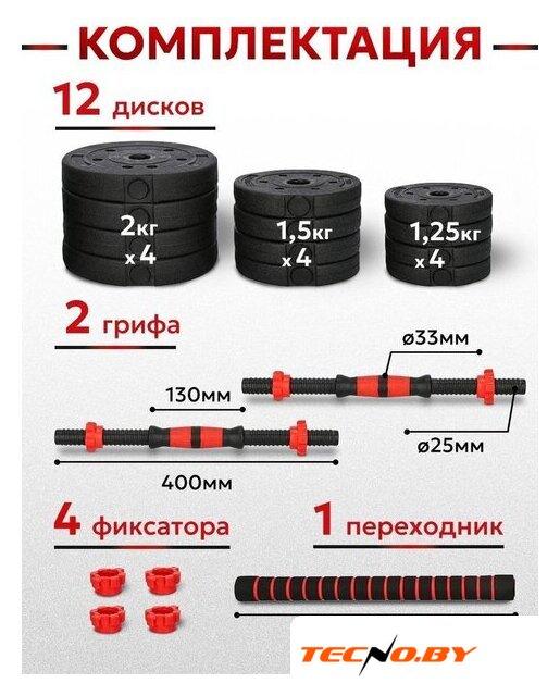 | Комплектация | Блины для гантелей — 12 шт.: 4 шт. по 2 кг, 4 шт. по 1.5 кг и 4 шт. по 1.25 кг. Пластиковые фиксаторы — 4 шт. Пластиковые грифы с металлическим сердечником 40 см — 2 шт. Переходник с гантели на штангу 40 см — 1 шт. |