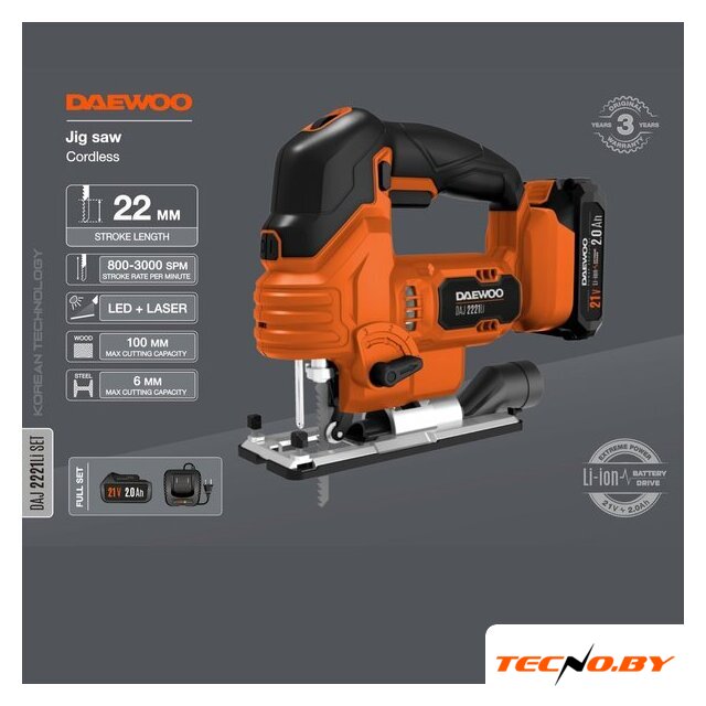 | Комплект поставки | - Лобзик - 1 шт.- Аккумулятор 2,0 Ач - 1 шт.- Зарядное устройство - 1 шт.- Пильное полотно -1 шт .- Шестигранный ключ -1 шт .- Руководство по эксплуатации - 1 шт.- Коробка |