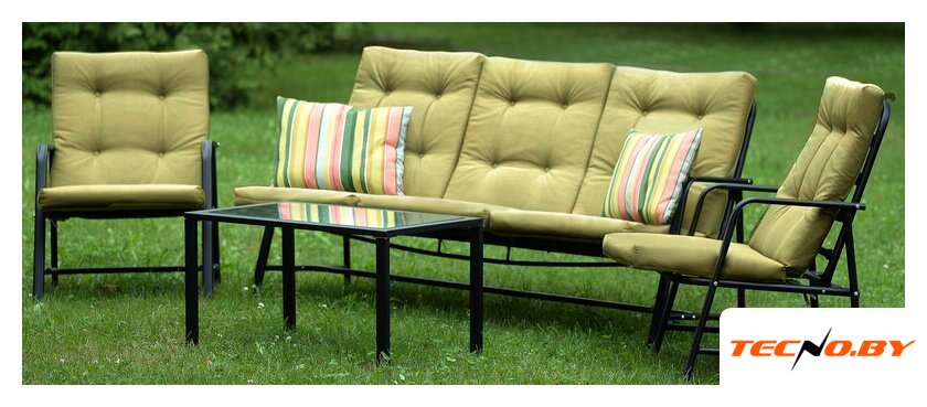 диван + 2 кресла + столик, стол: 750×450×410 мм, основание - сталь, столешница - стекло, сиденье: 60×74 мм, материал: ткань