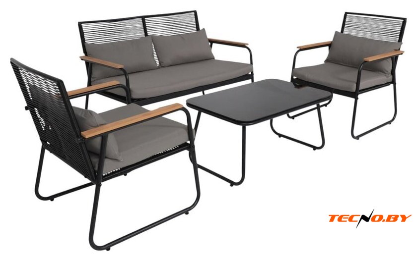 диван + 2 кресла + столик, стол: 800×500×450 мм, основание - сталь, столешница - стекло, сиденье: 650×640 мм, материал: ткань
