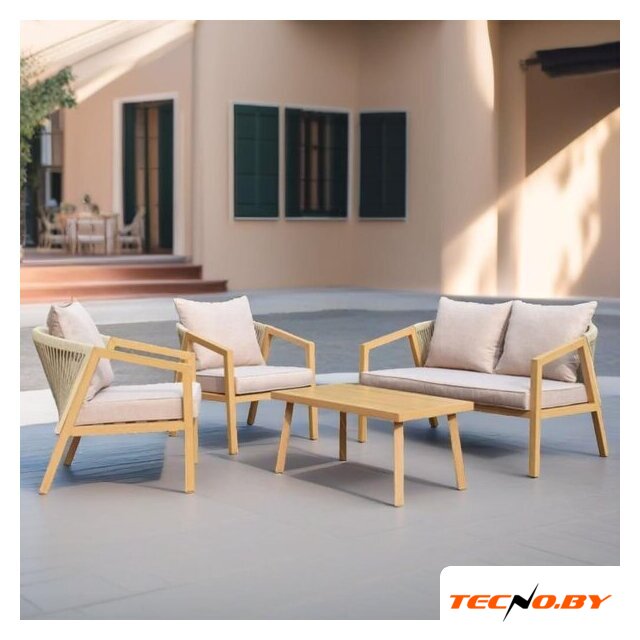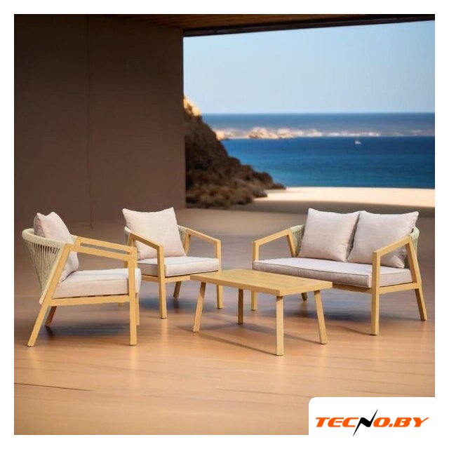 диван + 2 кресла + столик + 2 пуфика, стол: 1300×750×690 мм, основание - искусственный ротанг/металл, столешница - стекло, сиденье: 680×670 мм, материал: ткань