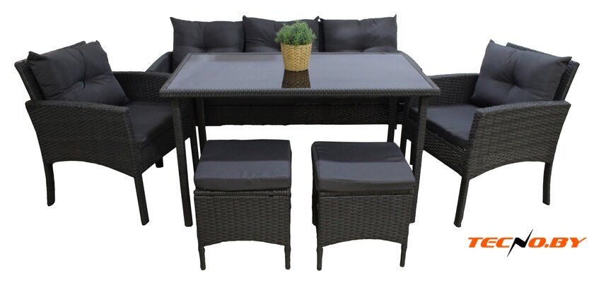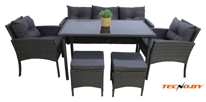 стол + 6 стульев, стол: 1300×900×740 мм, основание - искусственный ротанг, столешница - искусственный ротанг; сиденье: 580×600 мм, материал: ткань