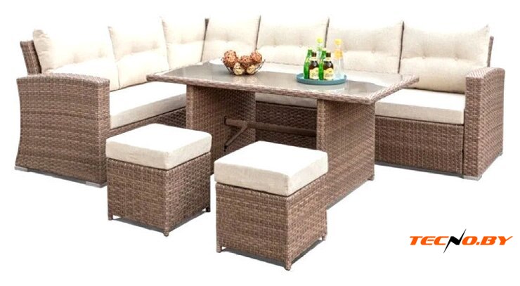 диван + 2 кресла + столик + 2 пуфика, стол: 1200×700×690 мм, основание - искусственный ротанг/сталь, столешница - стекло; сиденье: 600×660 мм, материал: искусственный ротанг