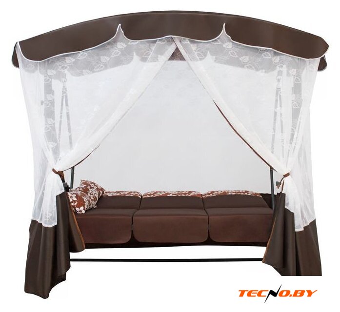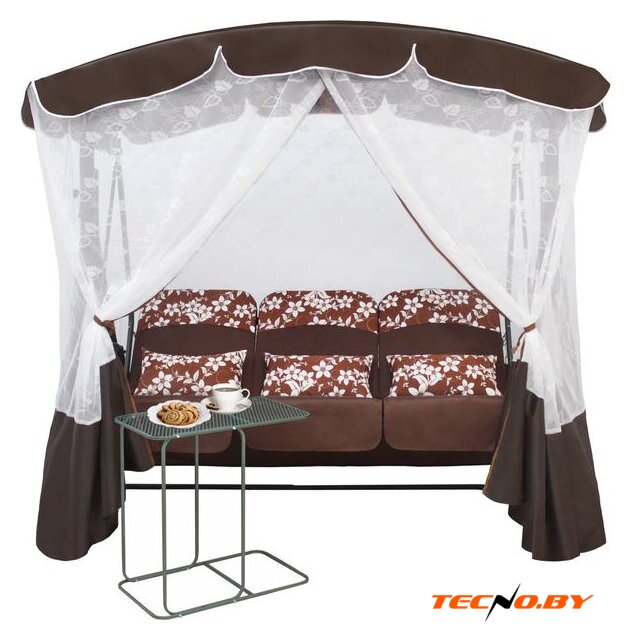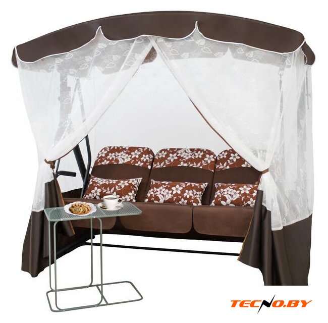Качели рассчитаны на три человека и снабжены прочными подлокотниками, обеспечивающими дополнительный комфорт. Наличие полок и металлического столика делают модели более функциональными, позволяя оставаться долго на свежем воздухе и устраивать пикники на дачной территории. Противомоскитная сетка создает дополнительную защиту от насекомых, что делает отдых исключительно приятным.