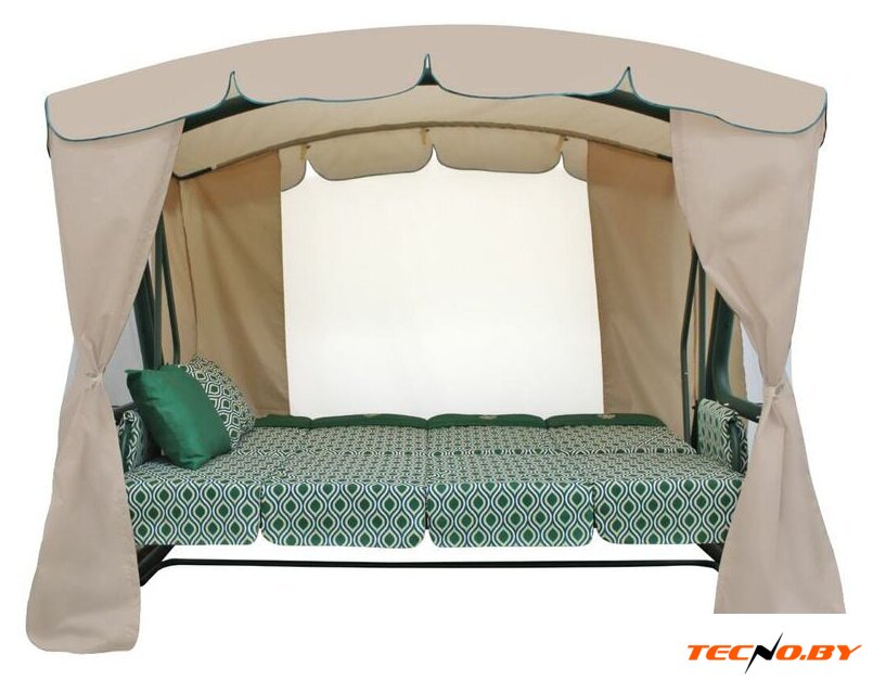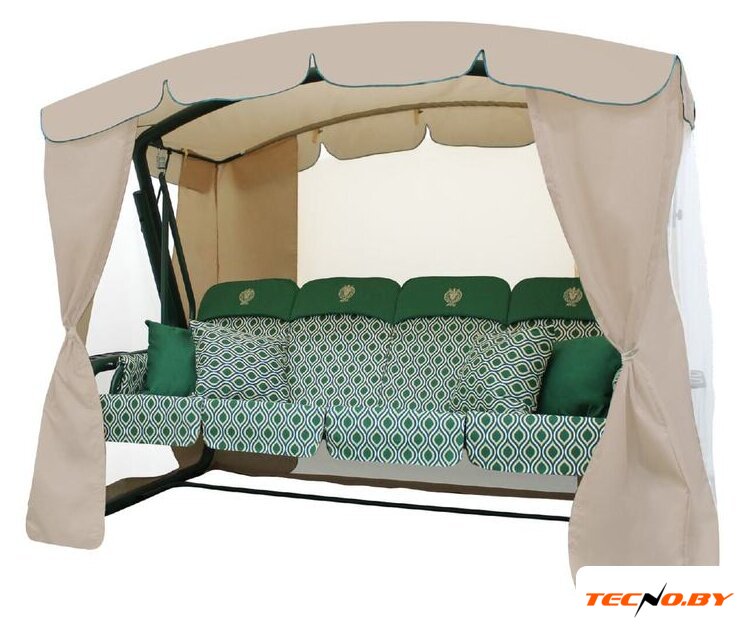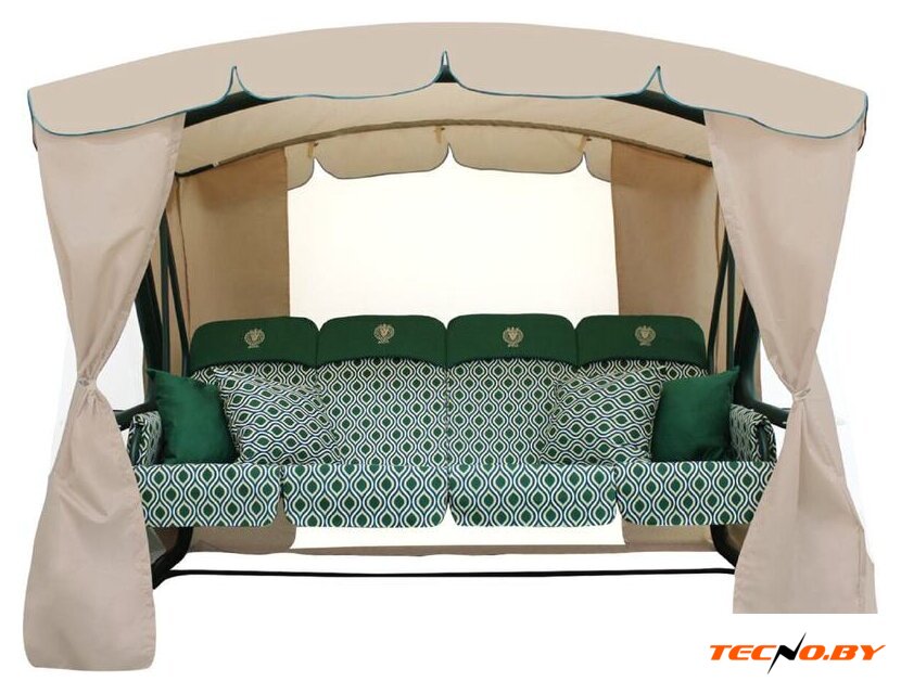 Качели оснащены подлокотниками, полками и подстаканниками, позволяющими наслаждаться комфортом и уютом. Для создания максимального удобства в комплекте идут мягкие подлокотники и тент-шатер с антимоскитной сеткой, защищающей от назойливых насекомых.
