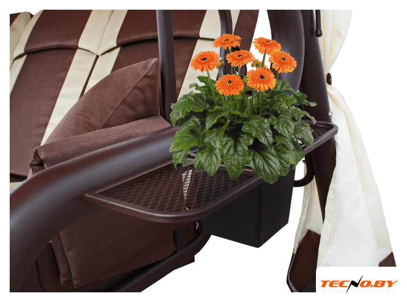 Каждая деталь качелей продумана до мелочей. Благодаря наличию раскладной и регулируемой спинки, вы можете выбрать наиболее удобное положение для отдыха или чтения книги. К тому же, на полках имеются два подстаканника и подставки под цветы, добавляя функциональности и уюта вашему отдыху.