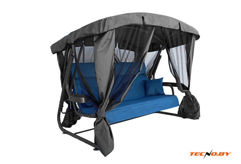 Качели выполнены из стали и имеют прочный устойчивый каркас с толщиной стоек 61 мм. Это позволяет выдерживать максимальную нагрузку до 400 кг, обеспечивая полную безопасность и надежность конструкции. Стальной каркас окрашен в стильные цвета — синий и черный, которые гармонично вписываются в ваш экстерьер.