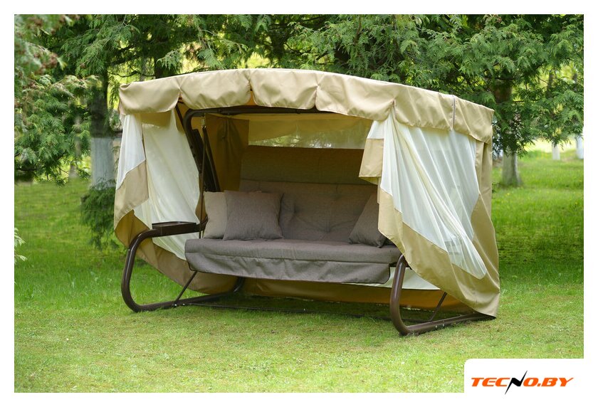 Садовые качели идут в комплекте с противомоскитной сеткой, которая защитит вас от назойливых насекомых и позволит полностью насладиться отдыхом без забот. Несмотря на крупные размеры (длиной 2820 мм), в сложенном состоянии качели легко транспортируются благодаря компактным размерам упаковки. А их вес в 93 кг делает конструкцию устойчивой даже при ветре.