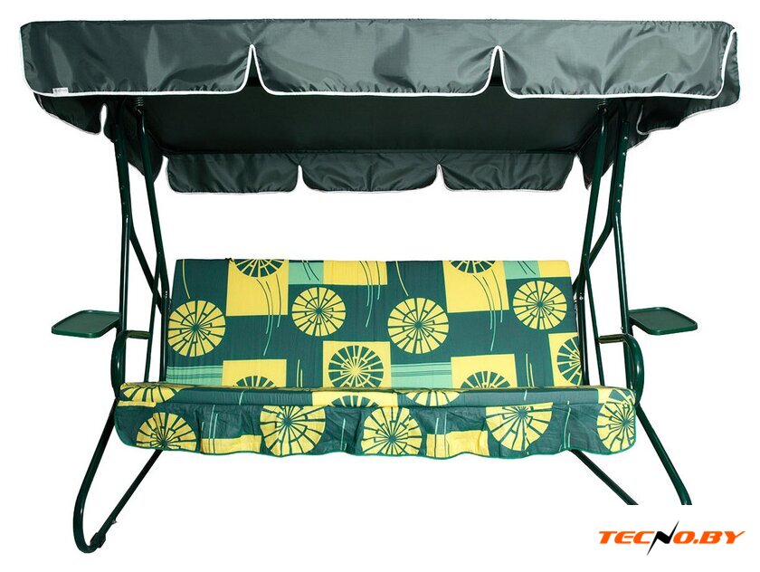 Сиденье выполнено из стальной сетки, обеспечивающей комфорт и долговечность использования. Качели рассчитаны на три места, что позволяет комфортно расположиться в кругу близких. Спинка модели раскладывается и регулируется, адаптируясь под нужды каждого пользователя и делая отдых еще более приятным. Для дополнительного удобства предусмотрены подлокотники и небольшие полки-столики для напитков или книг.