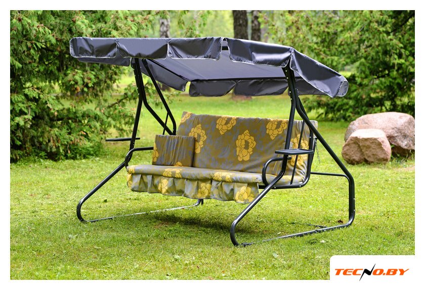 Качели оборудованы удобными подлокотниками и имеет встроенные полки (столики) для размещения напитков или книг. Толщина стоек составляет 38 мм, что гарантирует устойчивость и долговечность конструкции. Сочетание ярко-желтого, серого и цветного принта делает эти качели стильным акцентом любого сада.