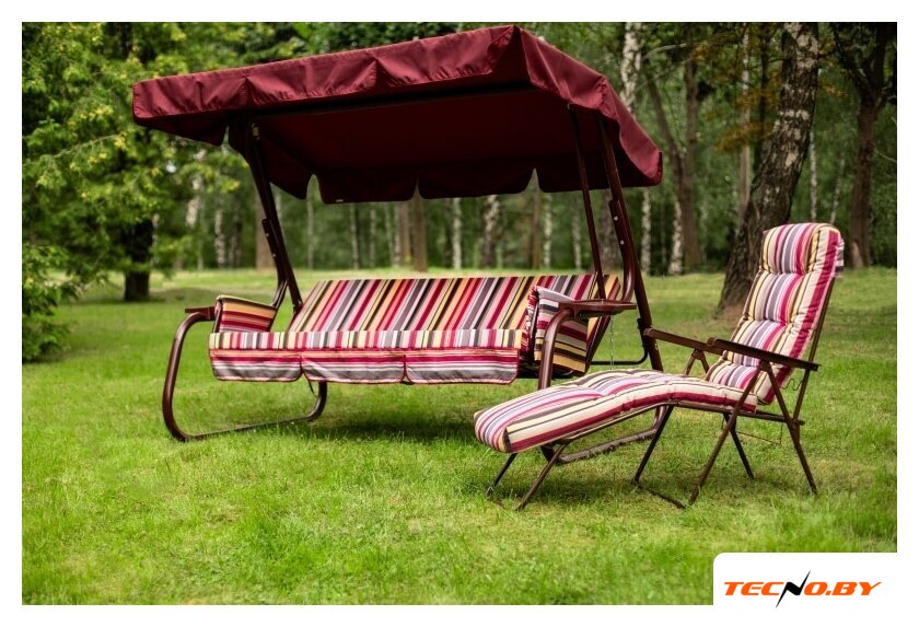 Эстетика модели радует глаз: качели выполнены в благородных бордовом и коричневом цветах. Они гармонично вписываются в любой садовый ландшафт, подчеркивая достоинства вашего двора и придавая ему нотку изысканности.