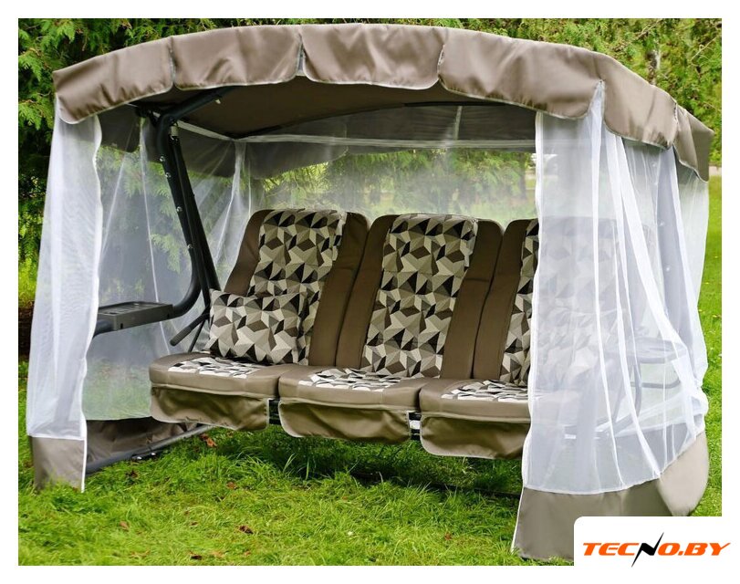 Качели выполнены в элегантных бежево-коричневых тонах, что придает им изысканный и современный вид. Каркас качелей изготовлен из прочной стали, что гарантирует долговечность и устойчивость к различным погодным условиям. Как частью его продуманного дизайна, качели оснащены мягким сиденьем, обеспечивающим комфортную посадку.