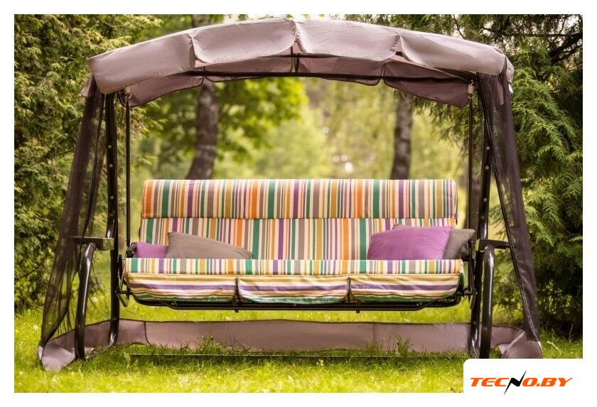 Садовые качели Olsa Турин-Премиум C1265 — это сочетание изысканности и комфорта. Их текстиль мягкого коричневого и фиолетового оттенков органично вписывается в любой ландшафтный дизайн, принося уют и стиль в ваш сад.