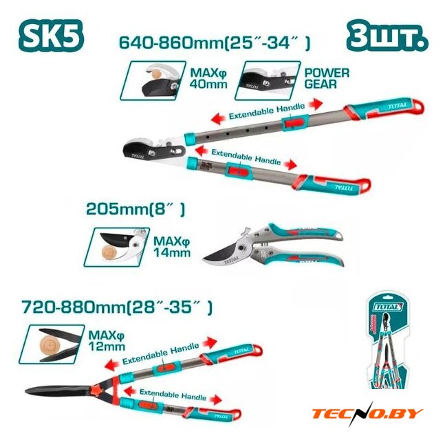 | Комплектация | - Секатор 205 мм (THT15308) - 1 шт.- Сучкорез 640-860 мм (THTS1527416) - 1 шт.- Ножницы для кустов 720-880 мм (THTS1516306) - 1 шт.- Блистер |
