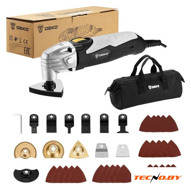 Комплект поставки | - Реноватор- Пильный диск – 7 шт.- Скребок – 2 шт.- Пильное лезвие – 3 шт.- Шлифлисты – 25 шт.- Насадка дельтовидная шлифовальная плита- Сумка- Коробка |