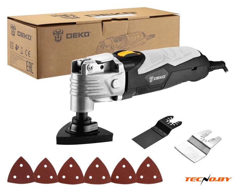 Комплект поставки | Многофункциональный инструмент - 1 штШлифовальный треугольник - 1 штСкребок - 1 штПильное лезвие - 1 штШлифлисты (Р40, 60, 80, 120, 240) - 6 штИнструкцияКоробка |