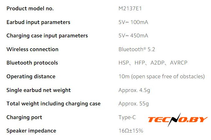| Быстрая зарядка | 5 минут подзарядки - 1 час воспроизведения |