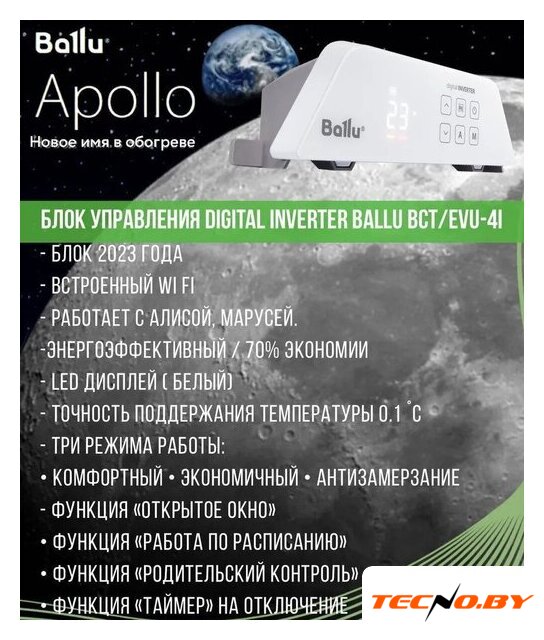 | Комплектация | Отопительный модуль конвектора Ballu BEC/AT-2500; Термостат для климатической техники Ballu Transformer Digital Inverter Wi-Fi BCT/EVU-4I; Ножки для обогревателя Ballu Apollo BFT/AT |