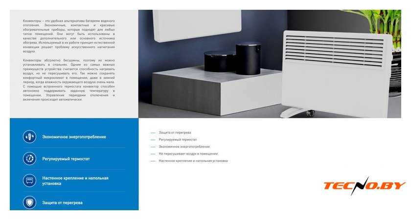 конвектор, 1000 Вт, термостат, крепление на стену, управление механическое
