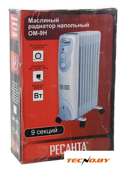 масляный радиатор, 2000 Вт, 9 секций, термостат, управление механическое, площадь обогрева 20 м2