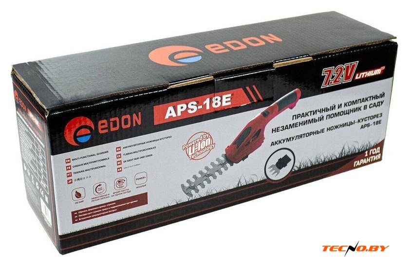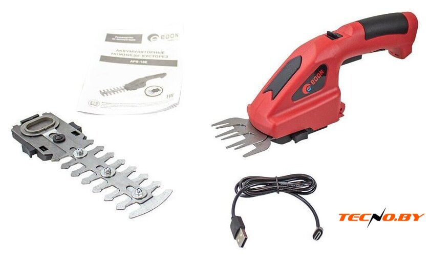 | Комплектация | - аккумуляторные ножницы-кусторез - 1 шт.;, - USB-кабель - 1 шт.;, - насадка для травы - 1 шт.;, - насадка-кусторез - 1 шт.;, - руководство по эксплуатации - 1 шт.;, - упаковка - 1 шт. |