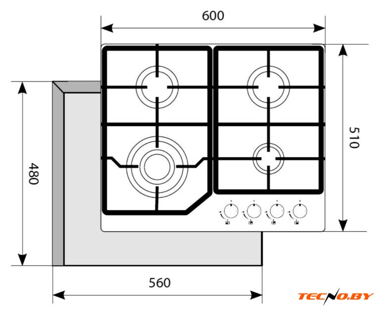 газовая на 4 конфорки, эмалированная сталь, механический электроподжиг, газ-контроль, независимая установка, размеры (ШхГ): 59.5x51 см