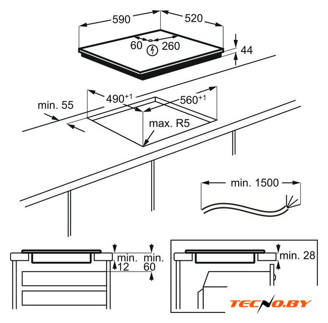 Варочная панель Electrolux CIT61443, с общими размерами 59 см в ширину и 52 см в глубину, предназначена для независимой установки. Для встраивания требуется ниша шириной 56 см и глубиной 49 см, что позволяет интегрировать панель в большинство кухонных гарнитуров.