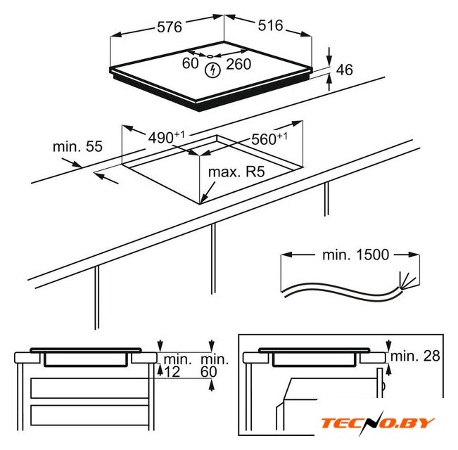 Габариты устройства составляют всего 57.6 см в ширину и 51.6 см в глубину, что позволяет удобно встроить варочную панель в кухонную мебель. Для установки достаточно ниши размером 56 см в ширину и 49 см в глубину, что делает монтаж простой задачей.