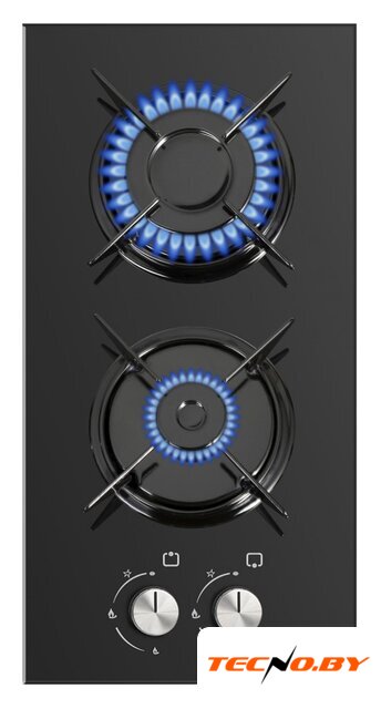 газовая на 2 конфорки, закаленное стекло, мощность: 4000 Вт, автоматический электроподжиг, газ-контроль, решетки: чугун, размеры (ШхГ): 30x52 см