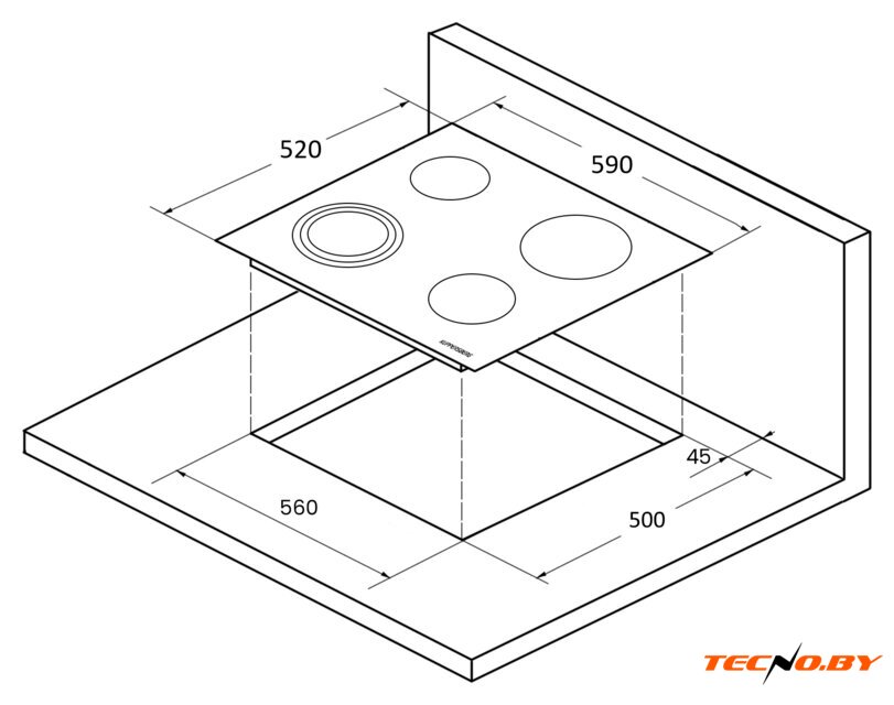 Варочная панель имеет габариты 59 см в ширину и 52 см в глубину, что обеспечивает оптимальное использование пространства на кухне. Ее независимая установка позволяет интегрировать панель в любой кухонный гарнитур, добавляя гибкость в планирование дизайна кухни. Размеры ниши для установки составляют 56 см в ширину и 50 см в глубину, обеспечивая простоту монтажа.
