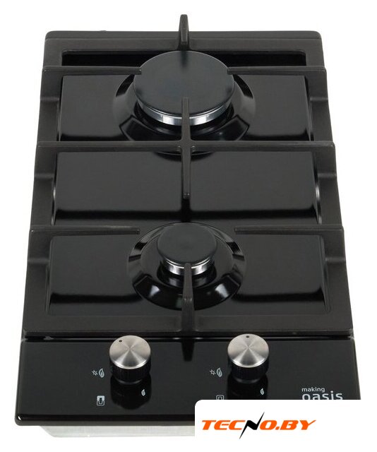 газовая на 2 конфорки, закаленное стекло, мощность: 3300 Вт, автоматический электроподжиг, газ-контроль, решетки: эмалированная сталь, независимая установка, размеры (ШхГ): 29x52 см