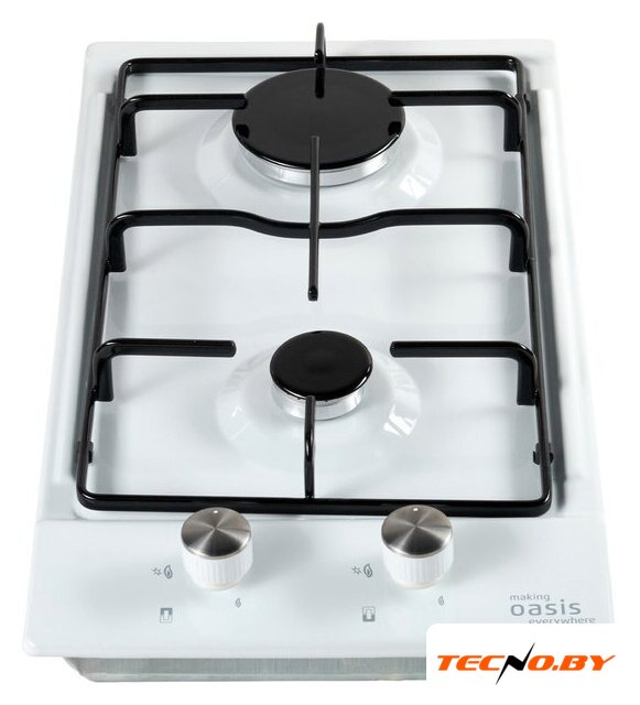 газовая на 2 конфорки, закаленное стекло, мощность: 3300 Вт, автоматический электроподжиг, газ-контроль, решетки: эмалированная сталь, независимая установка, размеры (ШхГ): 29x52 см