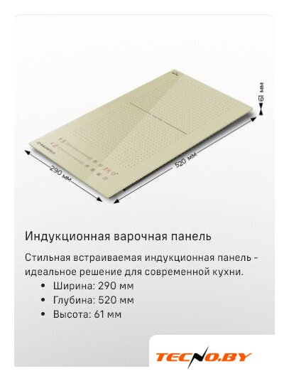 Благодаря своим компактным размерам (ширина 29 см и глубина 52 см), панель легко интегрируется в ограниченное пространство, оставляя больше места для других кухонных принадлежностей. Весит всего 5 кг, что делает ее удобной для установки. Для монтажа требуется ниша шириной 26.8 см и глубиной 49.5 см, что обеспечивает надежную фиксацию в кухонной мебели.