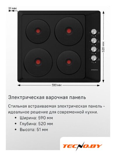 Ширина варочной поверхности составляет 59 см, а её глубина — 51.5 см, при этом она рассчитана для установки в нишу размером 56 см на 48.5 см. MAUNFELD EEHE.64.4W разработана для независимой установки, что позволяет интегрировать её в кухню в любом удобном месте. Это обеспечивает гибкость для различных вариантов планировки и расположения кухонной мебели.