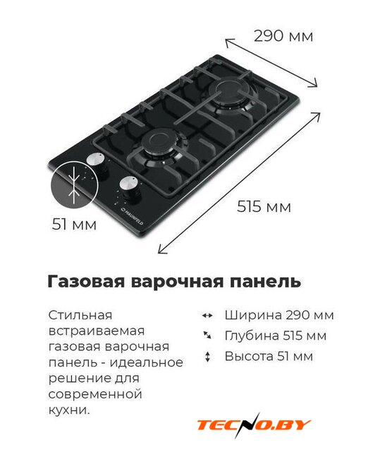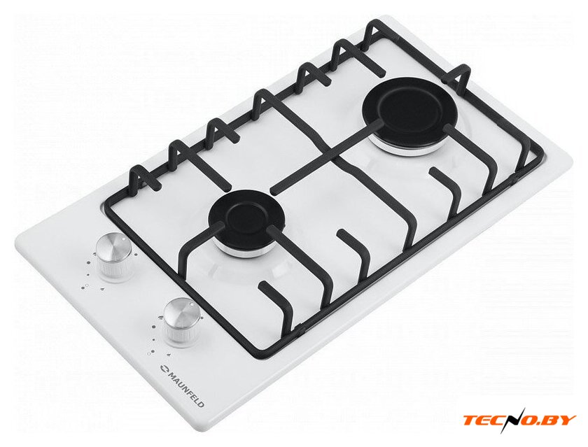 газовая на 2 конфорки, закаленное стекло, мощность: 4000 Вт, автоматический электроподжиг, газ-контроль, решетки: чугун, независимая установка, размеры (ШхГ): 30x52 см