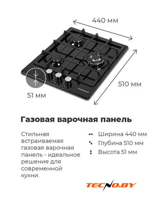 газовая на 3 конфорки, закаленное стекло, мощность: 6500 Вт, автоматический электроподжиг, газ-контроль, решетки: чугун, независимая установка, размеры (ШхГ): 44x51 см
