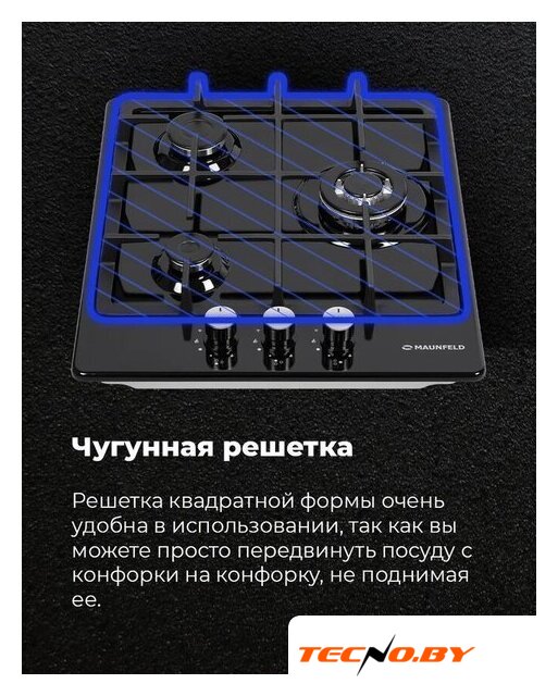 Панель оснащена тремя газовыми конфорками, разной мощности: 3000 Вт, 1700 Вт и 1000 Вт, включая одну конфорку WOK для любителей блюд в восточном стиле. Общая мощность панели составляет 5700 Вт, что позволяет быстро и эффективно приготовить любые блюда. Решетки выполнены из чугуна, что придаёт им прочность и устойчивость.