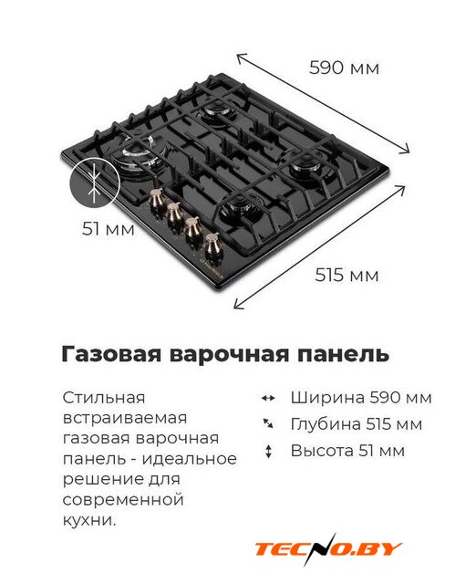 газовая на 4 конфорки, закаленное стекло, мощность: 9100 Вт, автоматический электроподжиг, газ-контроль, решетки: чугун, независимая установка, размеры (ШхГ): 59x51.5 см