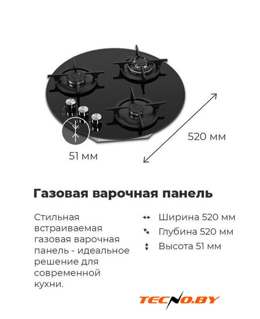 газовая на 3 конфорки, закаленное стекло, мощность: 5750 Вт, автоматический электроподжиг, газ-контроль, решетки: чугун, независимая установка, размеры (ШхГ): 45x52 см
