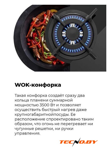 Три газовые конфорки обеспечивают общую мощность в 5 700 Вт, включая мощную WOK-конфорку на 3 000 Вт, которая идеально подходит для блюд требующих интенсивного нагрева. Остальные конфорки обладают мощностью 1 000 и 1 700 Вт, что позволяет выбрать оптимальный режим приготовления для любого рецепта.