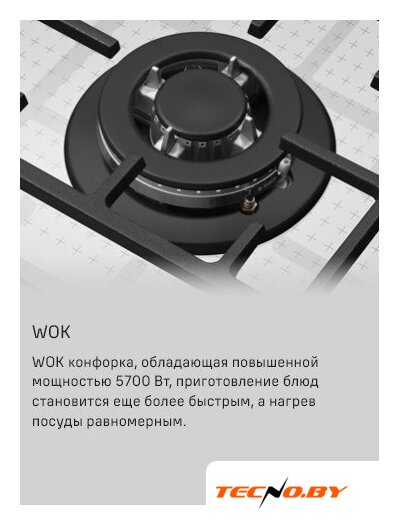 Это независимая варочная поверхность, имеющая три газовые конфорки. Одна из них — WOK конфорка, обеспечивает мощность 3000 Вт, идеально подходящая для быстрого нагрева и жарки в воке. Остальные две конфорки — 1700 Вт и 1000 Вт, дают гибкость в приготовлении различных блюд. Чугунные решетки гарантируют долговечность и надёжность.