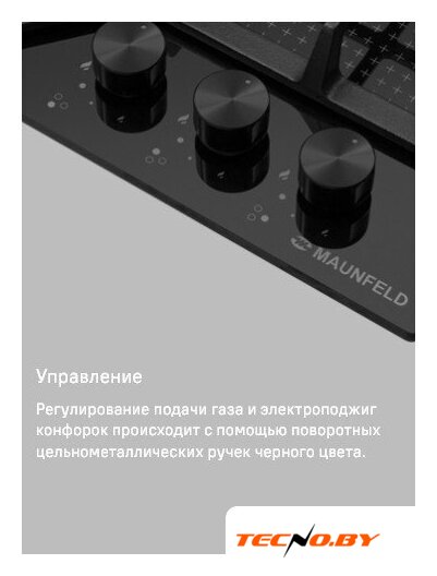Варочная панель MAUNFELD отличается простотой и удобством в использовании благодаря механическому управлению, расположенном спереди. Отсутствие сложных автоматических программ, таймера и индикатора остаточного тепла делает её особенно удобной для тех, кто предпочитает прямой контроль над процессом приготовления. Безопасность эксплуатации обеспечивает функция газ-контроля, что минимизирует риск утечек.