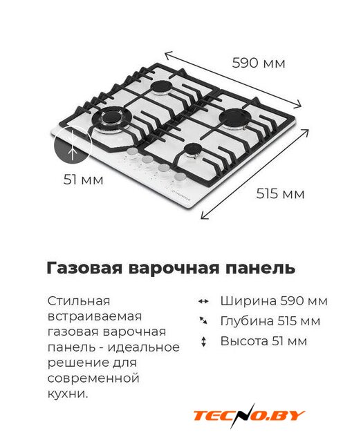 Размеры варочной панели составляют 59 см в ширину и 51,5 см в глубину, что позволяет легко встроить её в большинство кухонных интерьеров. Ниша для установки требует ширины 56 см и глубины 48,5 см. Эти размеры обеспечивают оптимальное использование пространства и легкость интеграции в вашу кухонную обстановку.