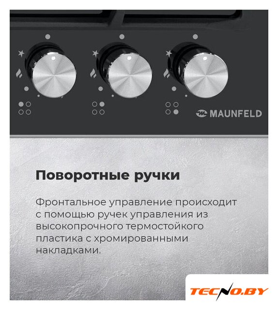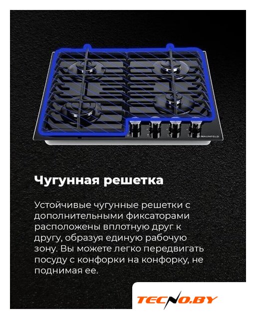 MAUNFELD заботится о безопасности своих пользователей. Устройство оснащено функцией газ-контроля, которая обеспечивает защиту от утечек газа. Чугунные решетки обеспечивают надежную фиксацию посуды на конфорках, предотвращая ее случайное скольжение во время приготовления, что добавляет дополнительный уровень безопасности.