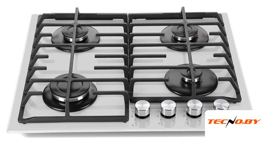 газовая на 4 конфорки, закаленное стекло, мощность: 7400 Вт, автоматический электроподжиг, газ-контроль, решетки: чугун, независимая установка