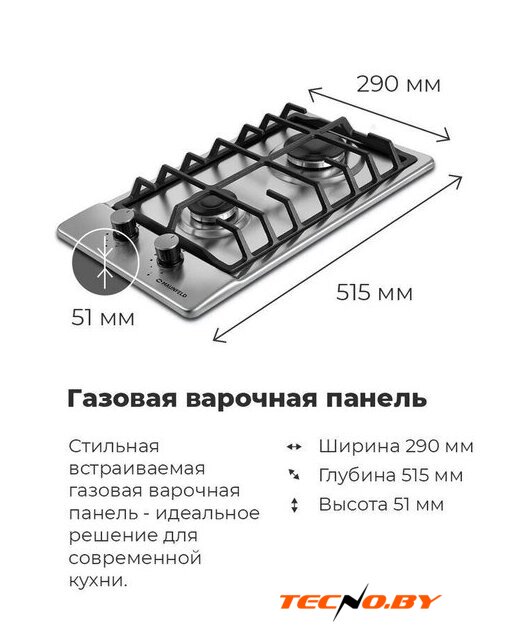газовая на 2 конфорки, закаленное стекло, мощность: 4000 Вт, автоматический электроподжиг, газ-контроль, решетки: чугун, независимая установка, размеры (ШхГ): 30x52 см