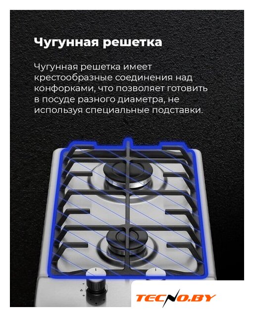 МАУНФЭЛД EGHS.32.6CS/G оборудована двумя газовыми конфорками, мощностью 1700 Вт и 2600 Вт, которые обеспечивают достаточно тепла для разных кулинарных задач. Несмотря на компактность, панель включает в себя чугунные решетки, которые гарантируют устойчивость кастрюль и сковородок, как больших, так и маленьких. Пульт управления расположен спереди, что даёт легкий доступ к нему в процессе готовки.