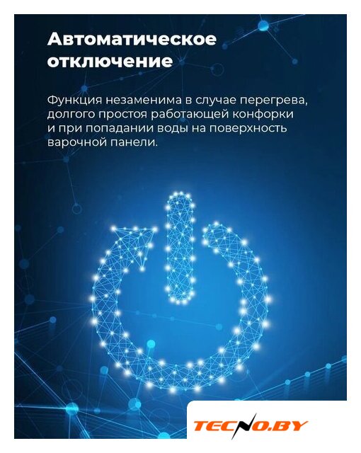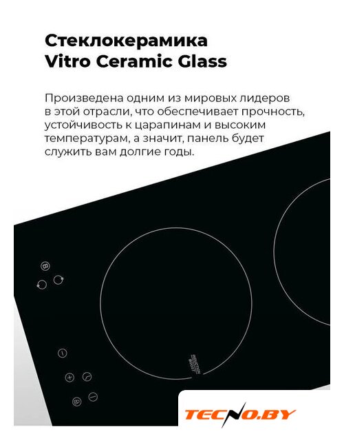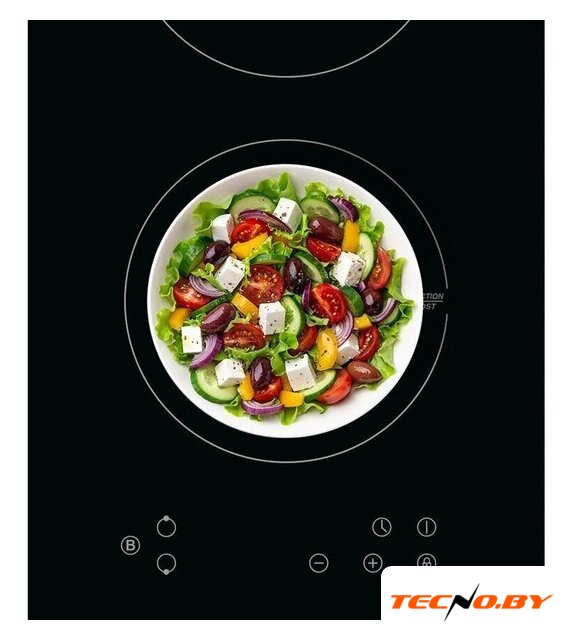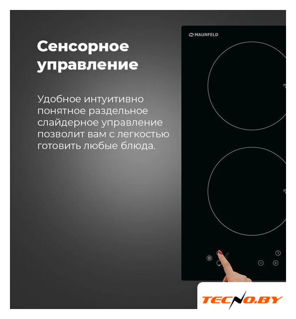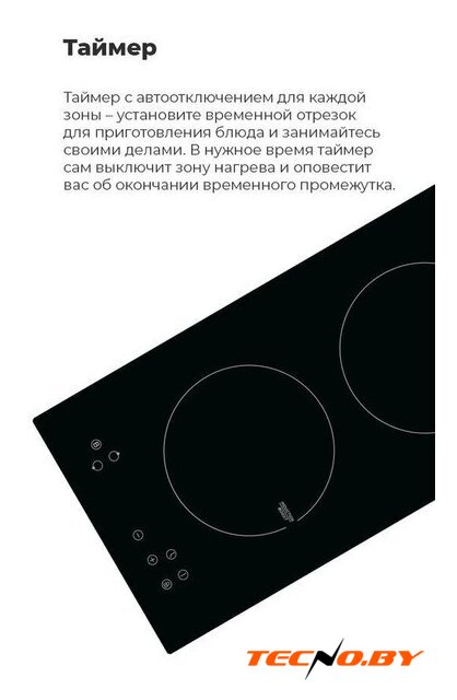 Сенсорное управление расположено спереди для удобного доступа и оснащено кнопками -/+ для плавного регулирования мощности конфорок. Легкость управления и простота использования становятся возможными благодаря интуитивно понятным элементам управления. Электронный таймер поможет вам идеально спланировать процесс приготовления, избегая подгорания или переваривания продуктов.